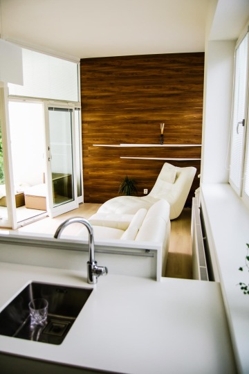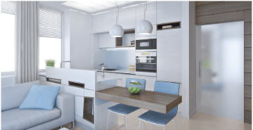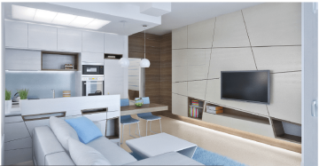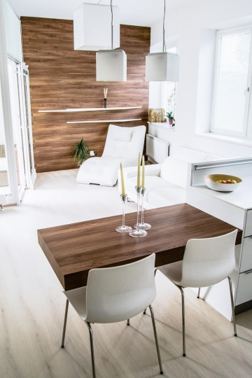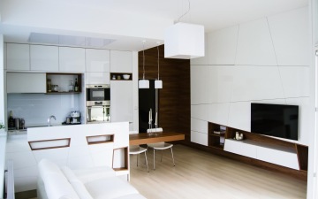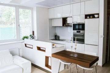 Výsledek našeho snažení je jen důkazem, že boje se zdánlivě malým prostorem se nám daří vyhrávat na plné čáře. Kombinace světlého, lesklého nábytku, převažující bílá a obecně spíše přírodní barvy v kombinaci s tmavšími odstíny dřeva, promyšlená koncepce umístění kuchyňského koutu a zasazení obývací části místnosti - to vše dělá z tohoto bytu útulné a komfortní útočiště, do kterého se bude mladá rodina vždy ráda vracet.