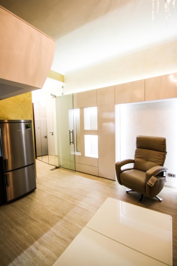 The walls with golden tinge bring a feeling of luxury that is supported by white high-gloss furniture. Dark browns, beiges and warm colors in general visually increase volume. The sophisticated lighting widens and opens the space. One of the ways to maximize space utilization was the placement of the sleeping area above the kitchen unit